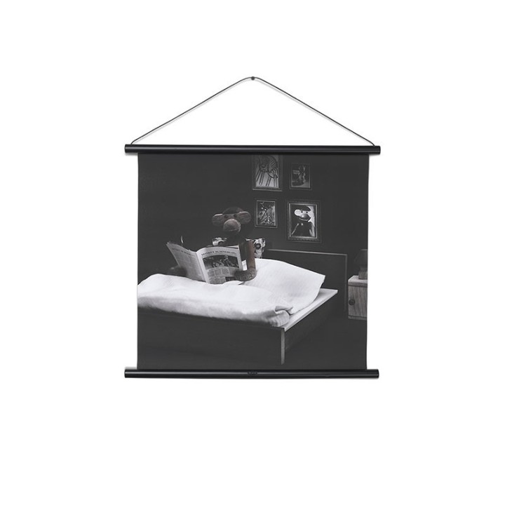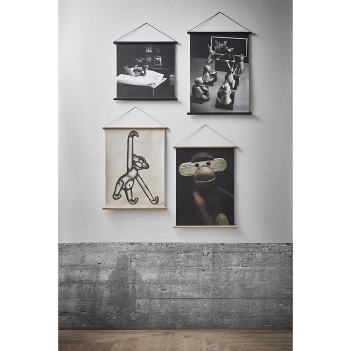 The popular monkey of Kay Bojesen is pictured here while reading a book just before bedtime. The photo is printed on 100% cotton canvas with black wooden frame and black leather cord. The dimensions are 40 cm wide and 40 cm high.