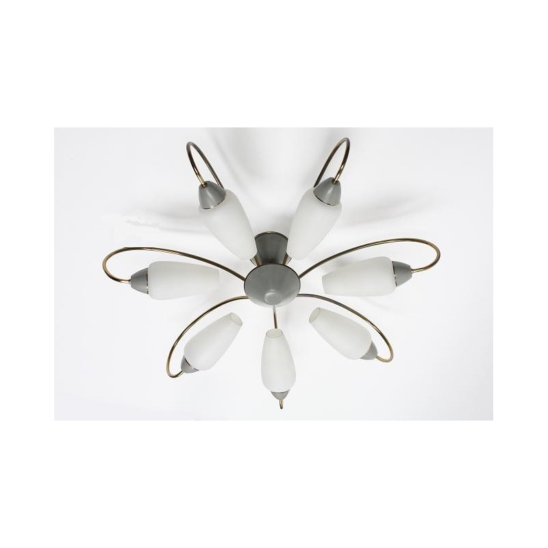 Grey with brass ceiling light with glass caps. The lamp is from the fifties and is in good original condition. The lamp is 73 cm in diameter and 25 cm high.