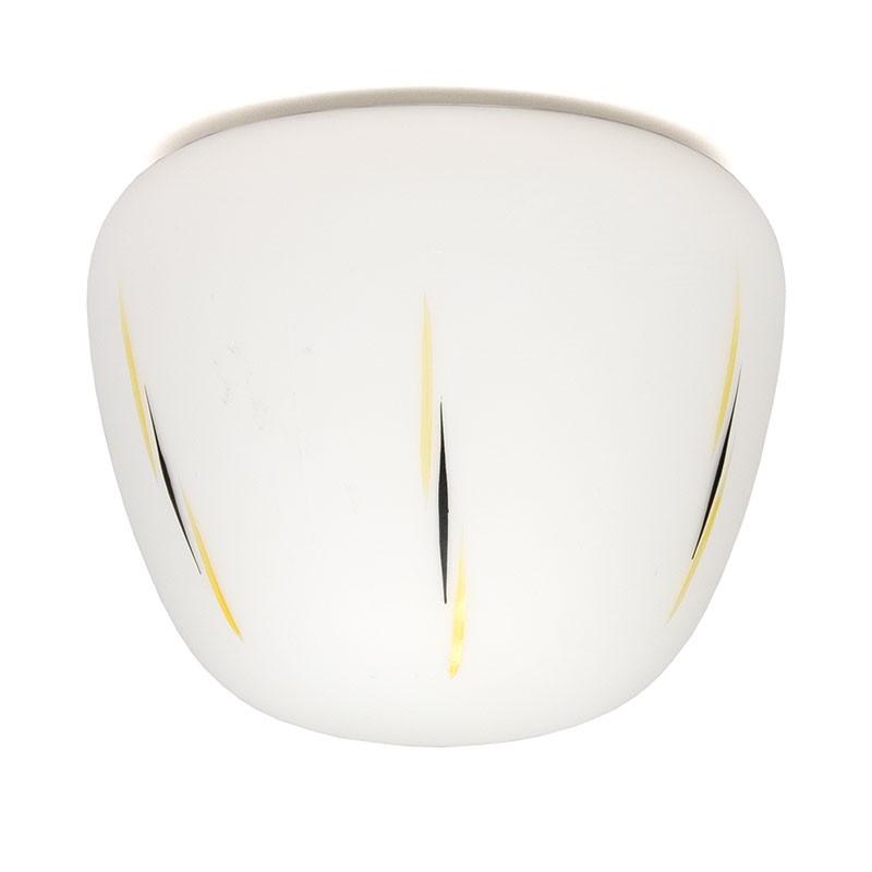 Ceiling lamp from the fifties. Beautiful milk glass vintage model with detail in yellow and black. The condition is good, undamaged, see details. The dimensions are 19.5 cm in diameter and 17.5 cm high.