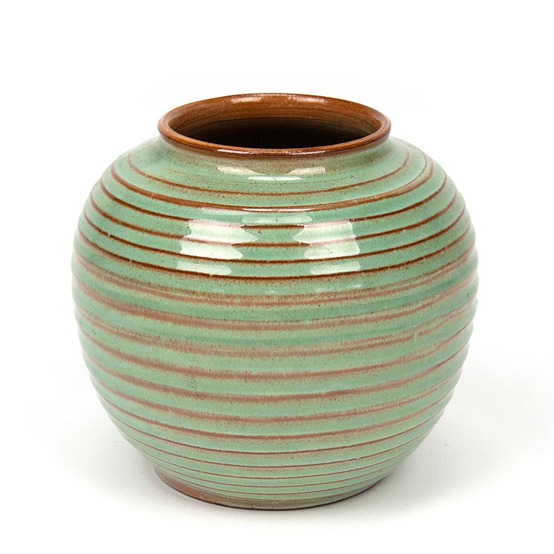 Green ceramic vase from the ADCO ceramic factory. Beautiful ribbed model in a green color, marked and numbered on the bottom (model number 1012). The condition is good, undamaged, see details. The dimensions are 10.5 cm high and 11 cm in diameter.