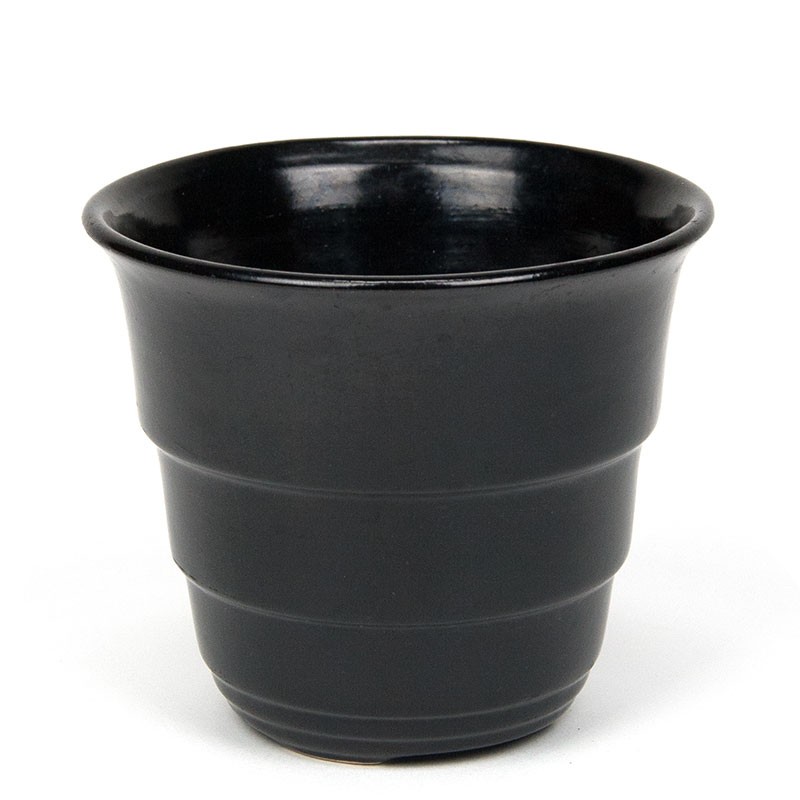 Small model flower pot in black. Dutch pottery from the fifties, not marked on the bottom. The condition is good, undamaged, see details. The dimensions are 10.5 cm in diameter and 9.2 cm high.