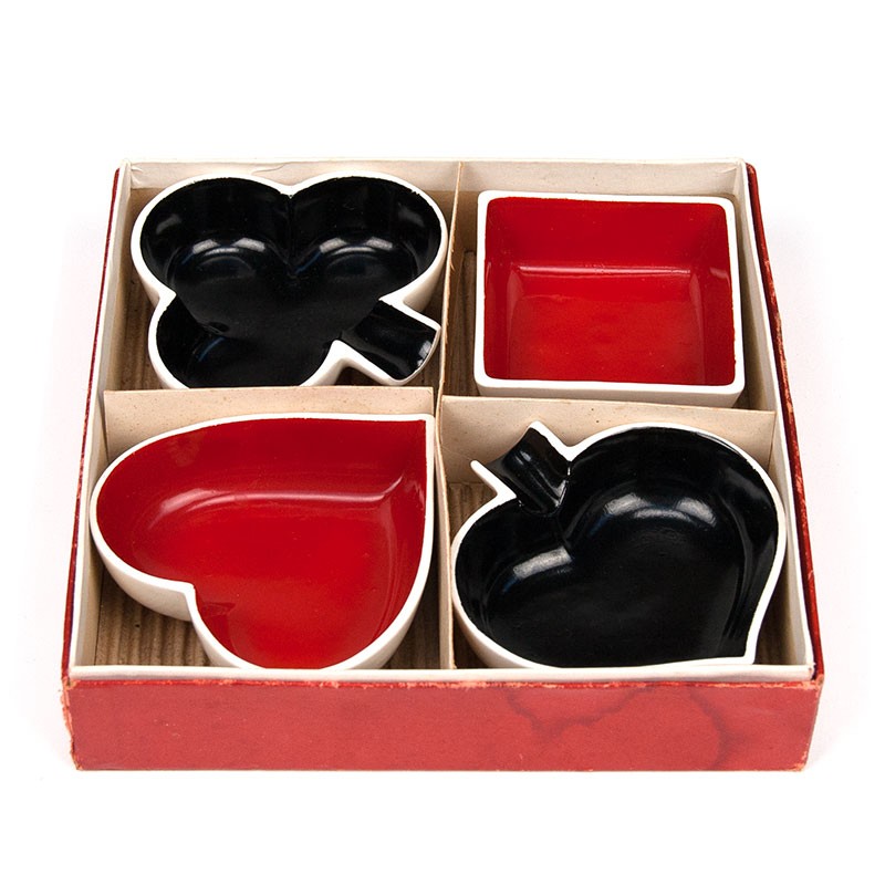 Playing card symbols as small ashtrays/bowls. The vintage gift set comes from the fifties and was released by P. Regout & Co Maastricht. The condition is good, the bowls/ashtrays are undamaged, see details. The dimensions of the box are 18 cm by 18 cm, the bowls are approximately 8.5 to 9.5 cm wide.