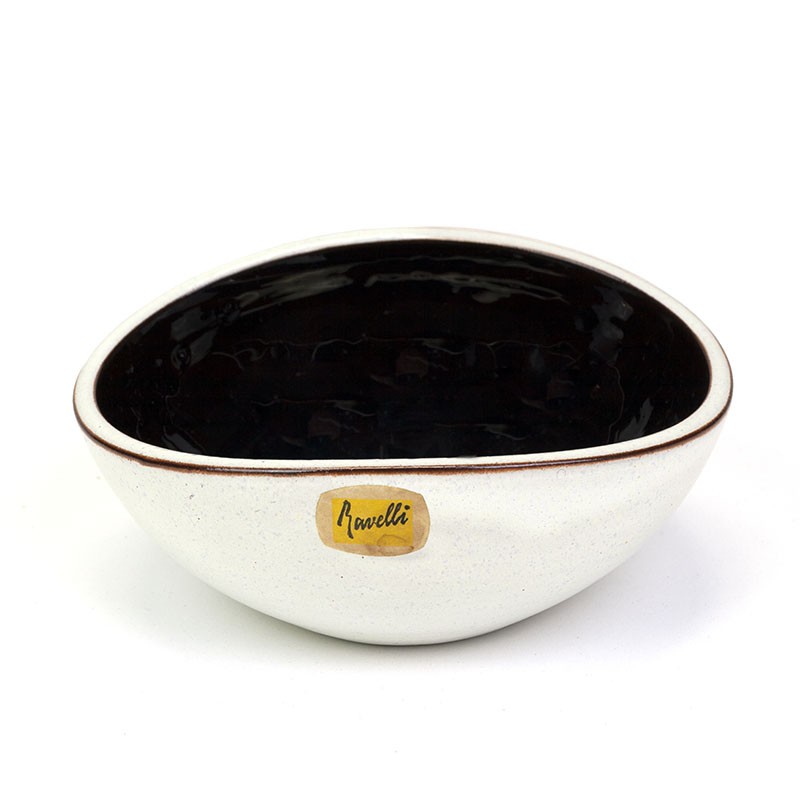 Dutch earthenware bowl by the artist Ravelli. Numbered item, number 216-1. From the period 1960-1970. The condition is good, no damage except for a single scratch on the inside. The dimensions are 13.5 cm wide, 11 cm deep and 5.5 cm high.