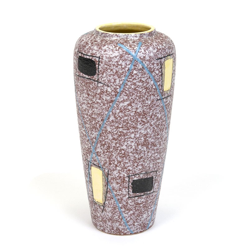 Earthenware vintage design vase. The vase is from the fifties / sixties and is marked Foreign. Beautiful vase with typical decoration from the fifties / sixties. The condition is good, undamaged, see details. The dimensions are 22.5 cm high and 10.5 cm in diameter.