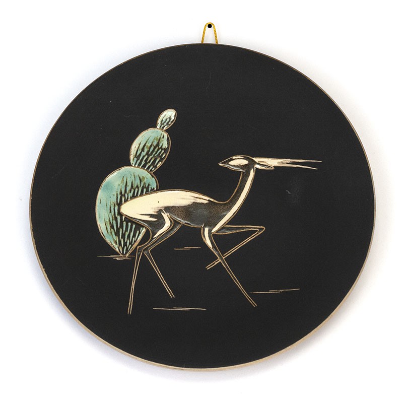 Decorative wall tile / plate from the late fifties, early sixties. Beautiful vintage item with a gazelle as an image, marked on the back. The condition is good, undamaged, see details. The diameter is 16.5 cm.