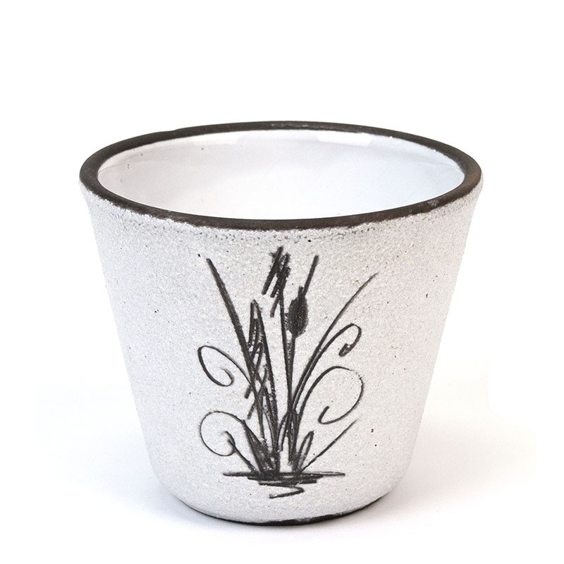 Small model flower pot from the sixties. Nice is the image of a piece of reed on the front. The condition is good, no snips, see details. The dimensions are 11 cm in diameter and 9.5 cm high.