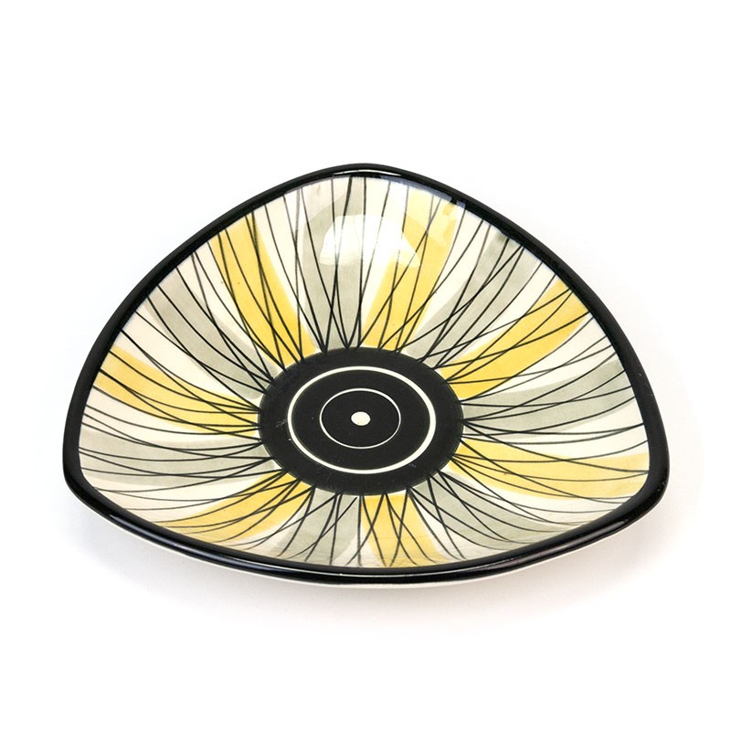 East German vintage plate from the fifties. Beautiful design and design. Marked on the bottom number 743 of Strehla keramik. The condition is fairly good, no snips, some light scratches. The dimensions are 23 cm wide and 4 cm high.
