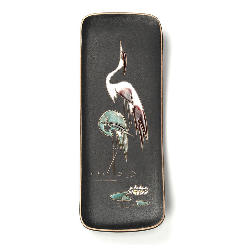 Vintage ceramic wall plate from the sixties. Beautiful decorated with an image of 2 cranes. Marked earth on the back Ruscha 740. The condition is good, undamaged, see details. The dimensions are 31 cm high, 12 cm wide and 3 cm high.