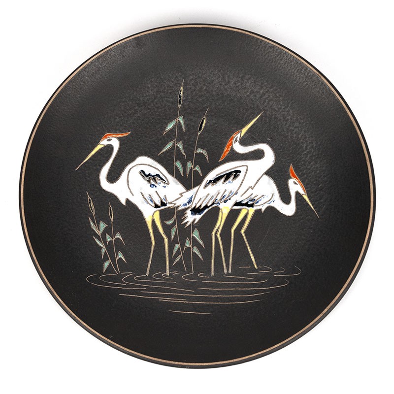 Earthenware wall plate from the German brand Ruscha. Handmade, with beautiful image of herons. Signed and numbered on the back, 717/3. The condition is good, undamaged, see details. The dimensions are 36.5 cm in diameter and 4 cm high.