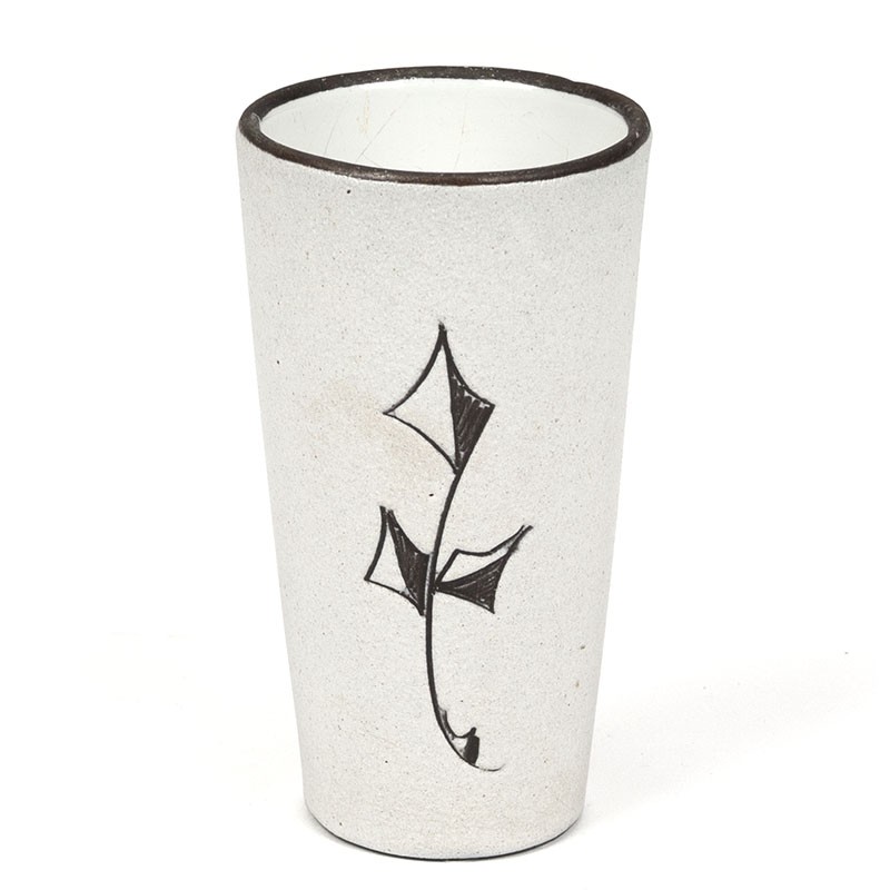 Small ceramic vase. From the sixties. Decorated with an abstract designed leaf. The condition is good, no snips, see details. The dimensions are 7 cm in diameter and 12.5 cm high.