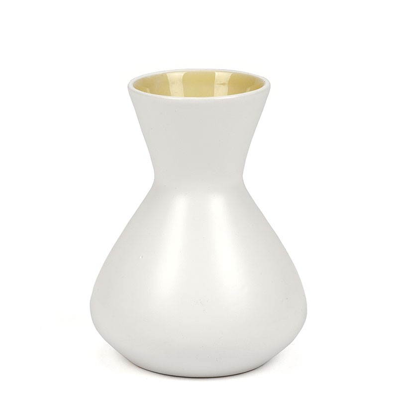 Small model vase of the ceramic brand Fris Edam. Numbered model 563, with yellow interior and matte white exterior. The condition is good, undamaged, see details. The dimensions are 9.5 cm in diameter and 12 cm high.
