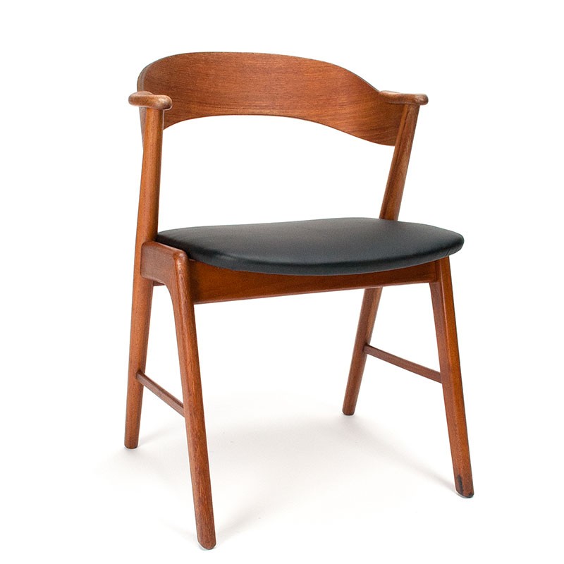 Design chair from the mid-sixties from Korup Stolefabrik. The design of the vintage chair, model 32, is attributed to Kai Kristiansen. Beautiful, stylish design with small armrest and beautiful round teak backrest. The condition is good, minimal signs of wear commensurate with age, see details. The seat has been reupholstered with black artificial leather. The dimensions are 54 cm wide, 46.5 cm seat height and 75 cm high.