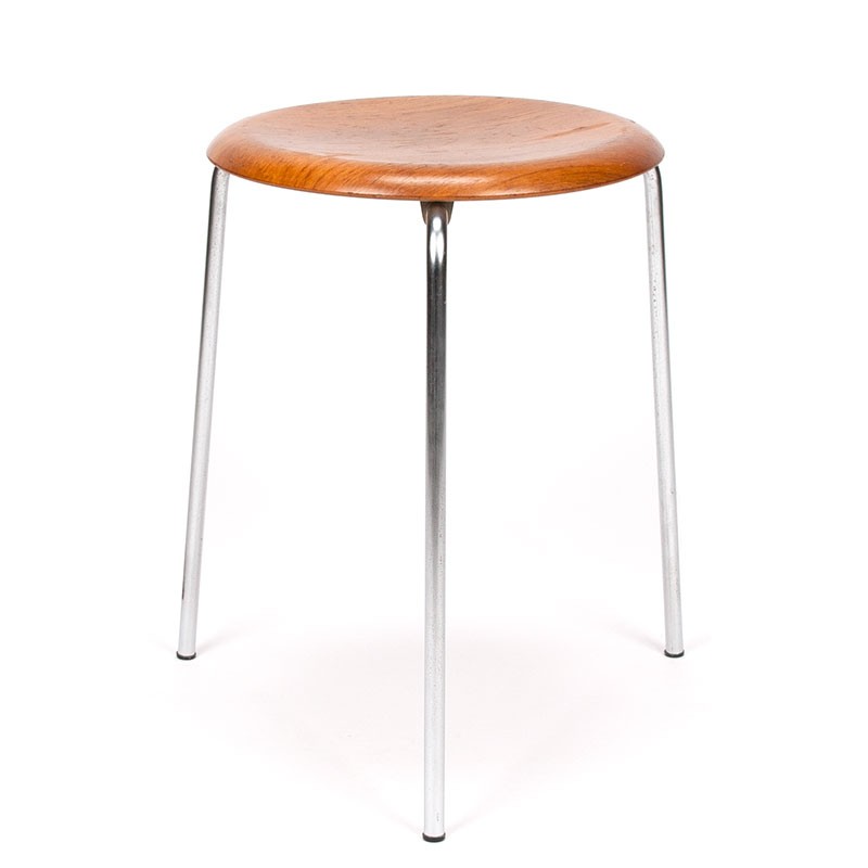 Mid-Century Danish vintage design stool. The stool is an early piece of the Dot by Arne Jacobsen released by Fritz Hansen (marked). The sticker shows number 0266. The condition is good considering the age, see details. The dimensions are 32.5 cm in diameter and 45 cm high.