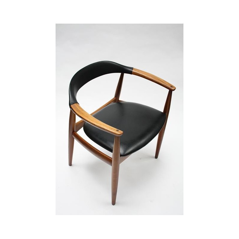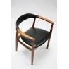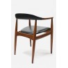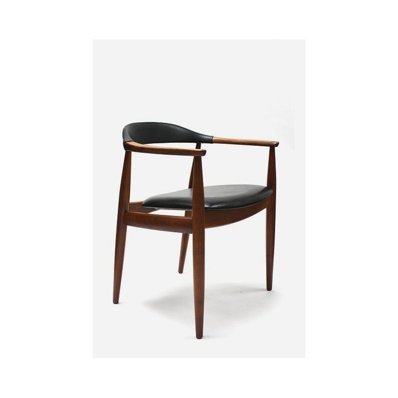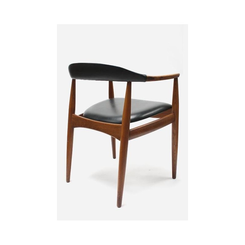 Nicely designed Danish design chair ( desk chair). The chair is design by W. Eilensen and has a nice detail in the armrest ( see detailed picture). The chair is made of teak and has black imitation leather. The chair is in good condition. The size is 62 cm W /