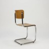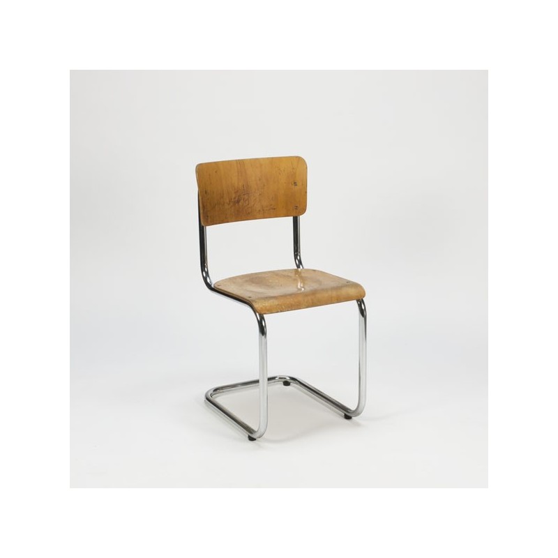 Vintage tube frame chair brand Tubax. The chair has a wooden seat and backrest and a chrome frame, the chair is marked at the bottom. The condition is reasonable given the age, see detailed pictures. The size is 82 cm H / SH 46,5 cm / 40 cm W.