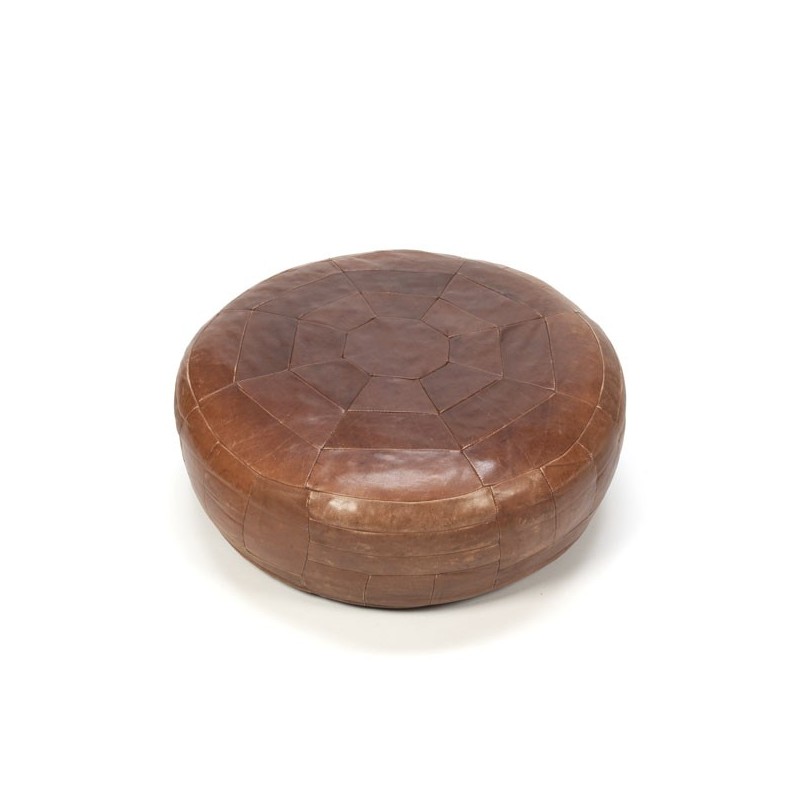 Vintage ottoman from the seventies. The ottoman is made of leather and is given the age, in fair condition. The dimension is 80 cm in diameter and is 32 cm high.