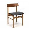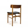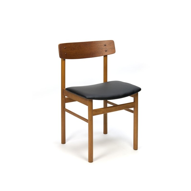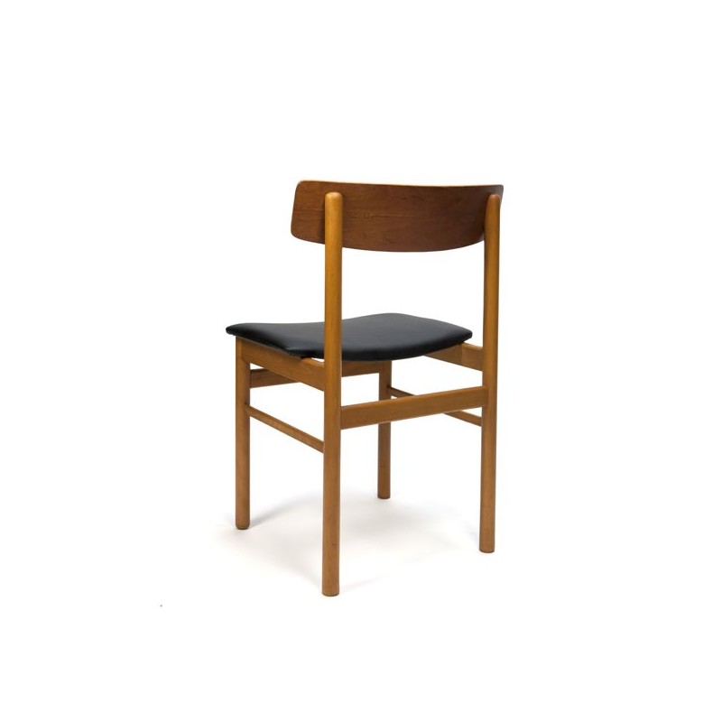 Vintage set of six Danish dining chairs from the mid sixties. The chairs have a nice backrest in teak and oak frame. The condition is good considering the age, the seats are reupholstered with black leatherette, see the detail photos. The dimensions are 46.5 cm W/ 46 cm SH / 76 cm H.
