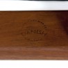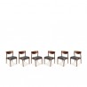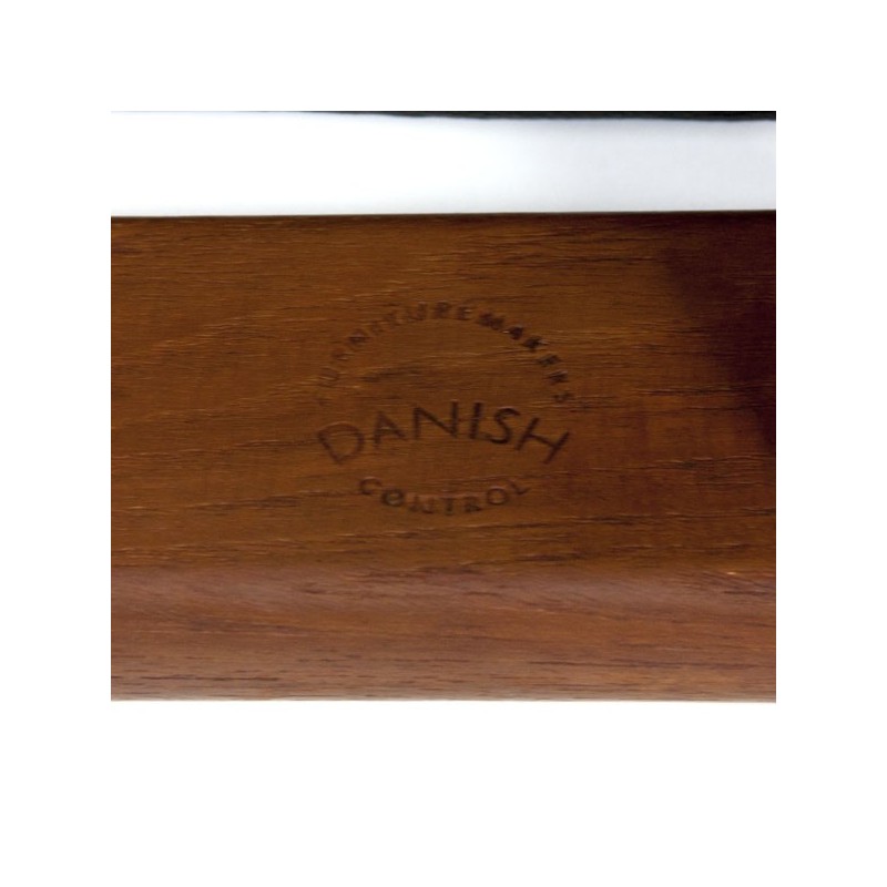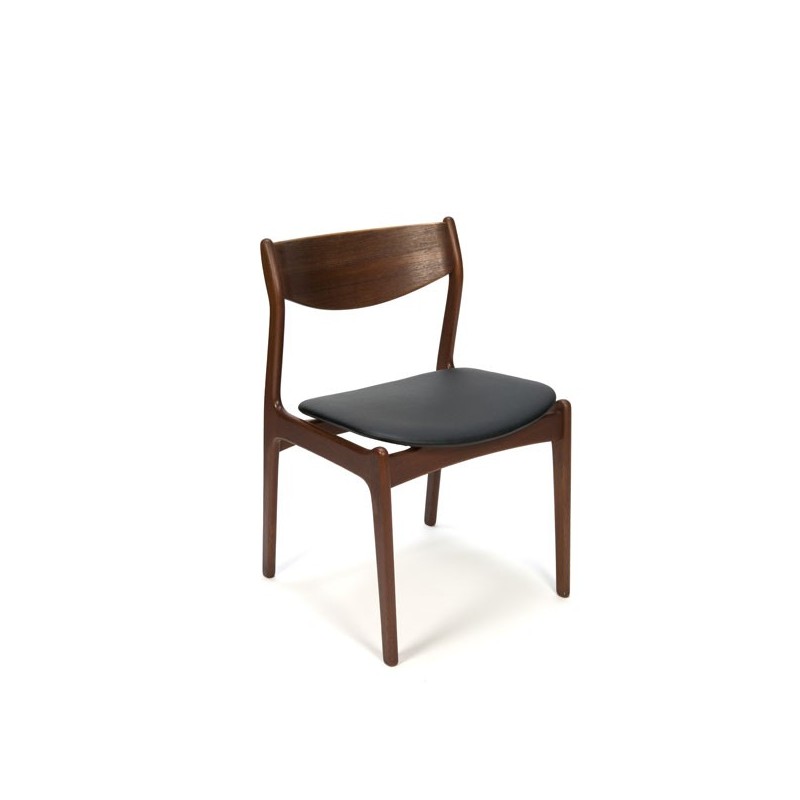 Danish design set of 6 luxury dining chairs designed by Erik Buck in the sixties. The seats are marked also with the Danish quality label: Danish Furnitures Makers. The chairs are made of a dark shade teak, the seats are upholstered with black imitation leather ( new). The condition is good, see also the detailed pictures. The dimensions are 48 cm W / 45.5 cm SH / 75 cm H.