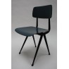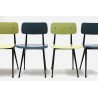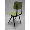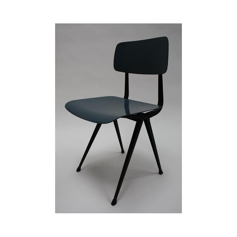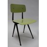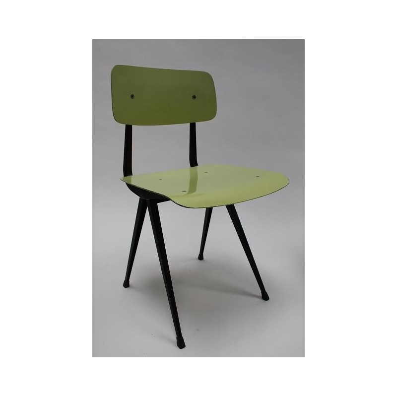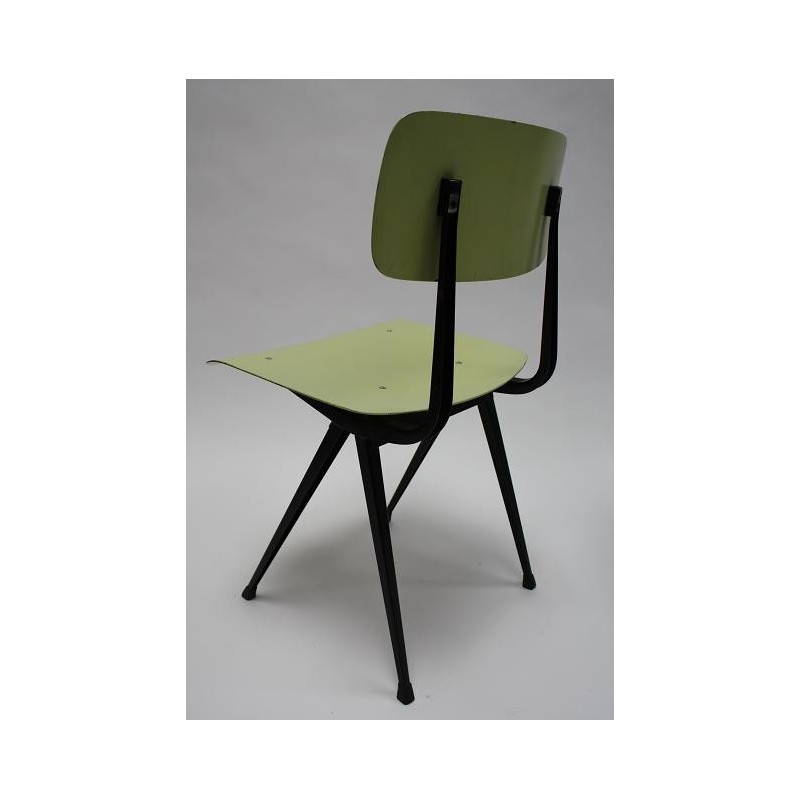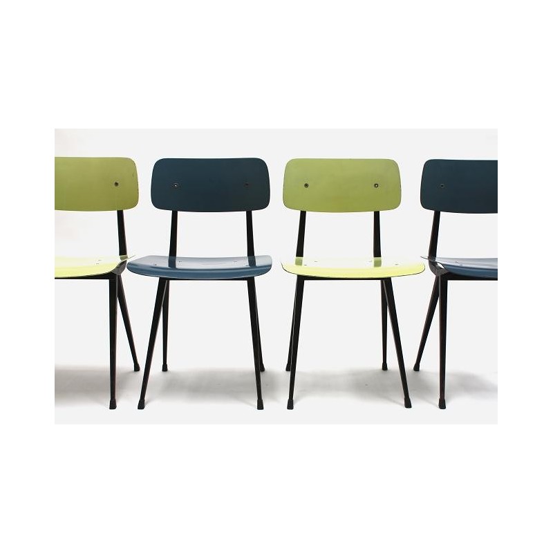 Rare early set of 4 Result chairs. The implementation of the seats with a special green and blue plastic seat and backrest is very particular. The chairs, designed in 1958 by Friso Kramer and produced by Ahrend de Cirkel, are in a beautiful original condition. The size is 45 cm W / 46.5 cm SH/ 80 cm H.