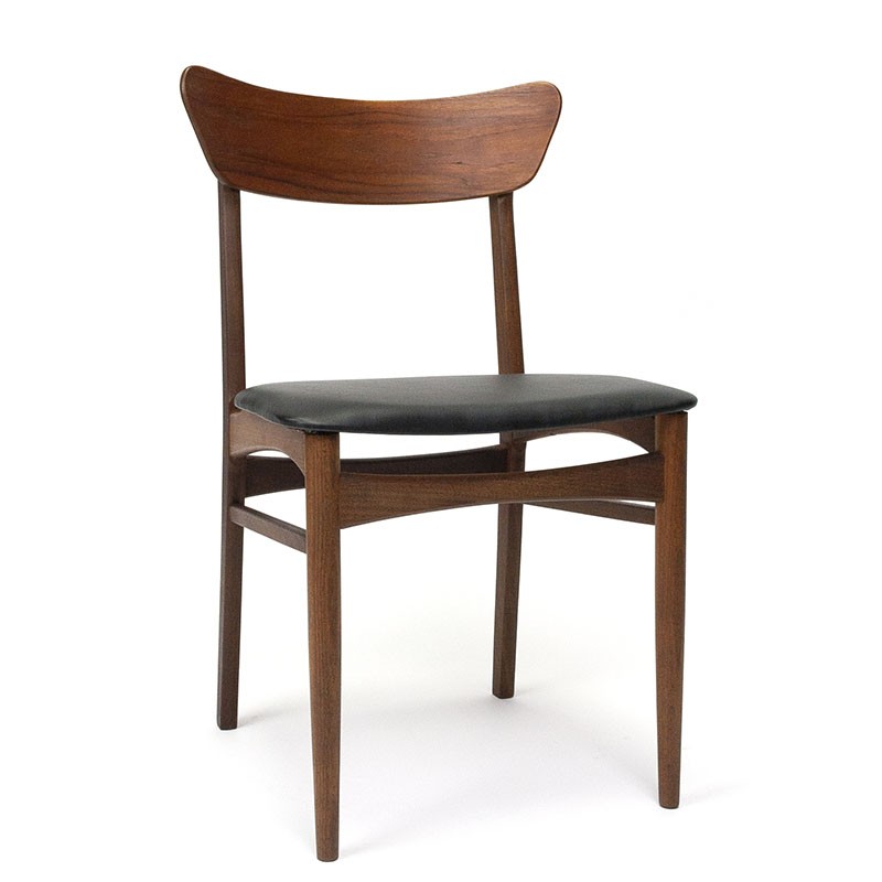 Dining table chair from Denmark, mid sixties. Vintage chair in a dark shade of teak with new black skai leather seat. The condition is good, minimal traces of use, see details. The dimensions are 47 cm wide, 45.5 cm seat height and 77.5 cm high.