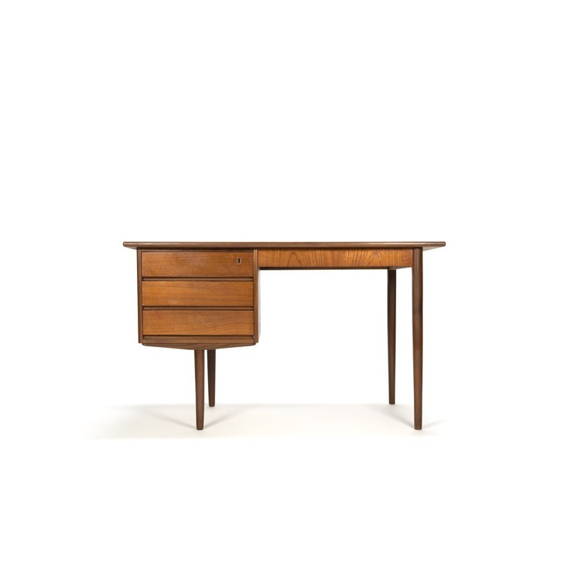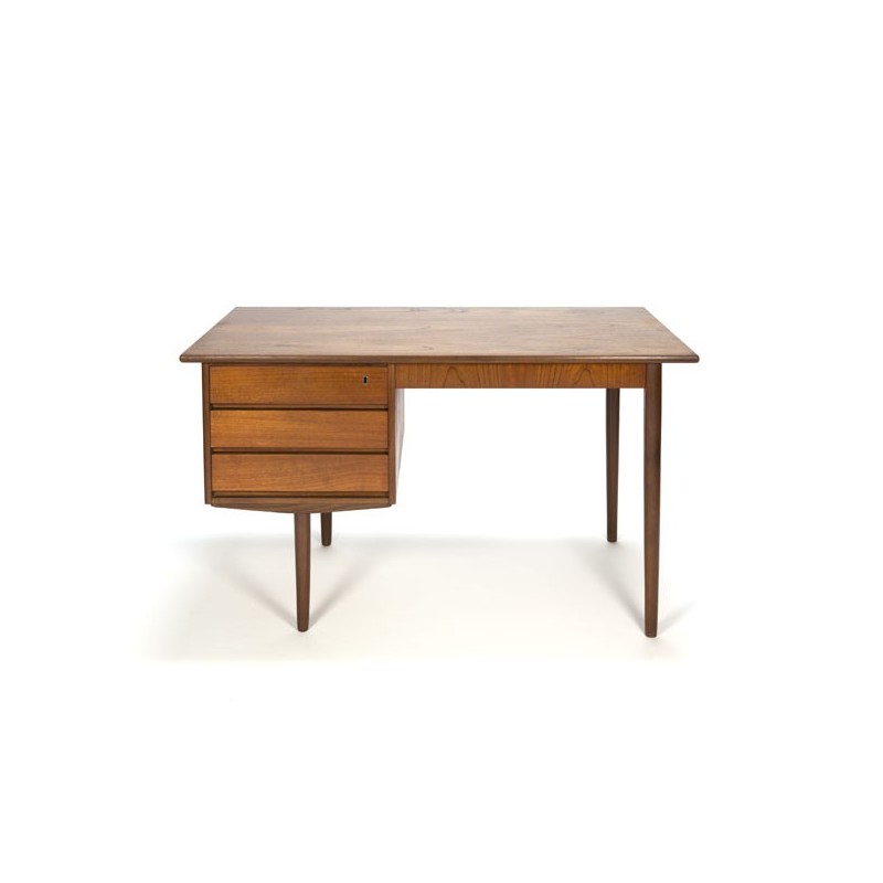 Vintage design bureau made in teak, from the sixties, Denmark. The desk has a beautiful grain pattern on the blade and has three drawers. The condition is good considering the age, some slight wear visible on the blade, see the detail photos. The dimension is 123 cm L / D 65 cm / 73.5 cm H.