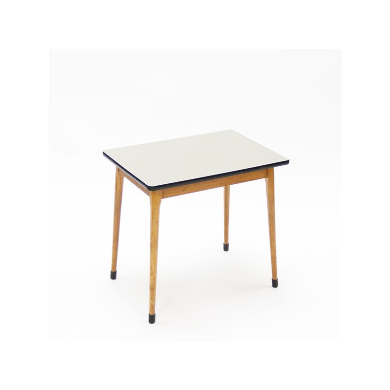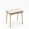 Vintage school table from the seventies with a wooden base and formica top. The condition is fairly good, but there are traces of use, see the detail photos. The size is 60 cm L / 42 cm W / 63 cm H.