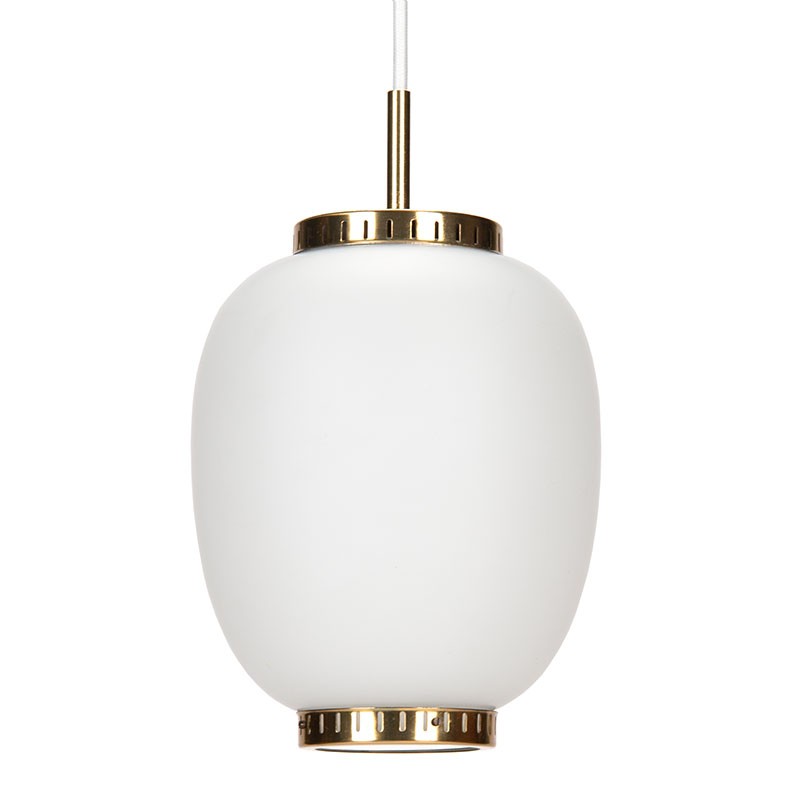 Vintage design pendant lamp from the fifties. Called the Kina pendant, designed by Bent Karlby. Early version in white milk glass with brass details, including matt glass diffuser. Beautiful stylish vintage lamp. The condition is good considering the age, wiring has been renewed. The dimensions are 22 cm high (30 including the brass pipe) and 17 cm in diameter.