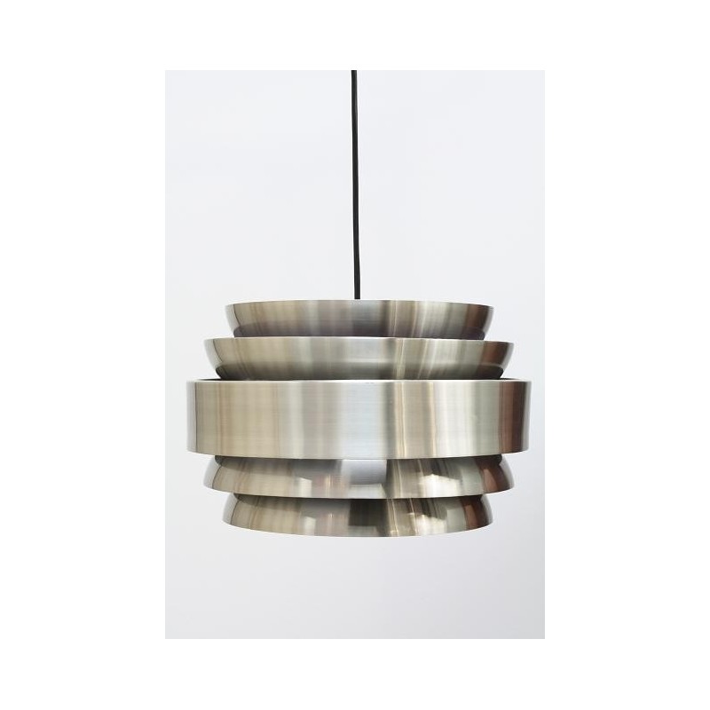 Aluminum hanging lamp from Scandinavia. The lamp is aluminum colored on the outside and purple on the inside, it gives a nice effect when the lamp is on. The lamp is in a good condition. The size is 30 cm in diameter and 20 cm high (without cord).
