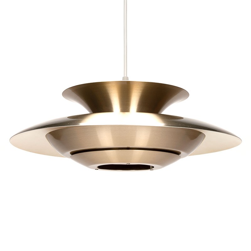 Vintage pendant lamp with a brass exterior and cream interior. The lamp is from Scandinavia, 1960-1969. It's beautifully designed so you don't look directly at the light source. It's in good condition, with no dents or scratches; see details. It measures 45 cm in diameter and 15 cm high (wiring has been replaced).