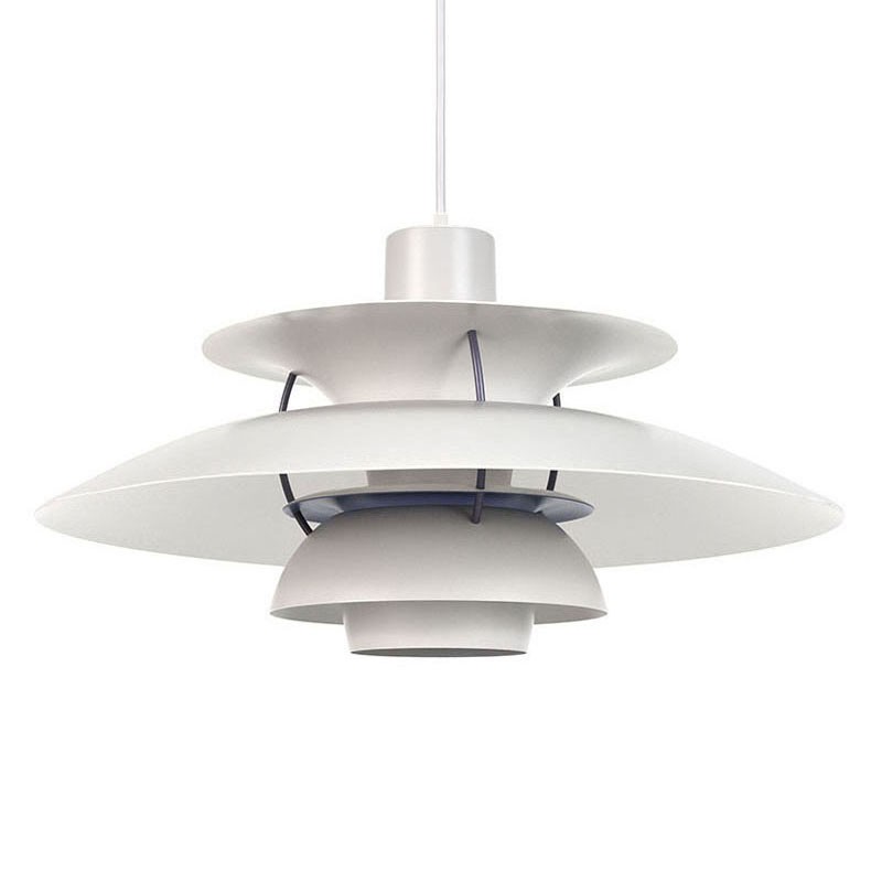 Danish design pendant lamp, designed by Poul Henningsen in 1958 and released by Louis Poulsen. The vintage PH 5 lamp is an early edition (see loose orange part). It's white with red, blue, and purple details in the center of the lamp. A beautiful, timeless pendant lamp that provides beautiful, atmospheric lighting. It's in good condition; the wiring has been replaced and there are no dents or scratches, see details. The dimensions are 50 cm in diameter and 28.5 cm high.