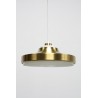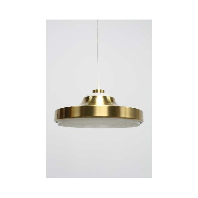 Hanging lamp from the seventies made of brass-colored metal. The lamp has a plastic diffuser on the top and bottom. The lamp comes from an old stock and has never been used, the state is very good. The size is 39