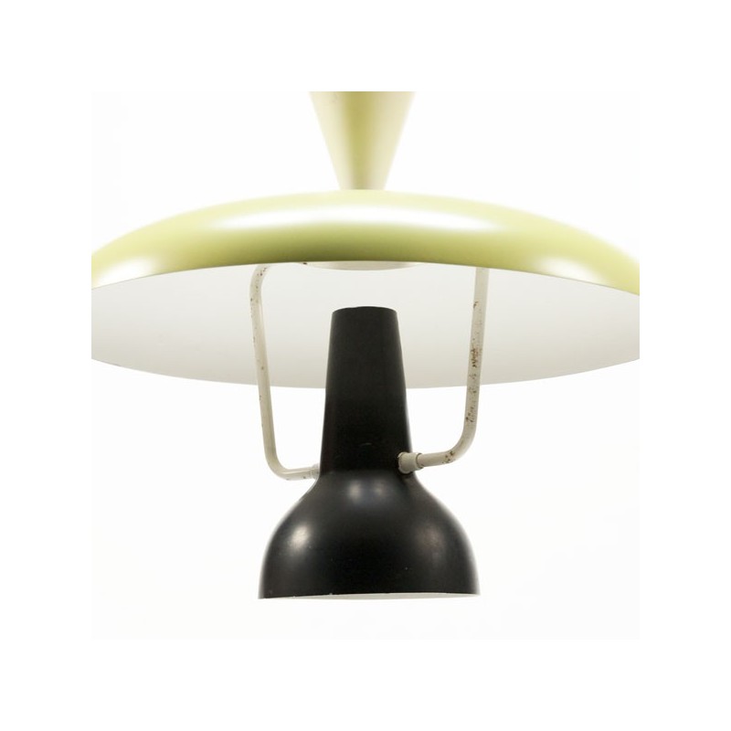 Rare Dutch design hanging lamp by Hala Zeist, designed by H.Th.A. Busquet in the fifties. The metal lamp is in good condition considering the age, only slight traces of use, also see the detailed pictures. On the white bracket are some small spots of oxidation visible. The dimension is 39,5 cm in diameter and 35 cm high.