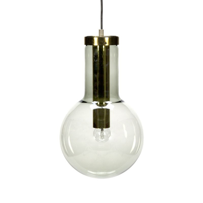 Dutch vintage design pendant. The lamp is made by Raak Amsterdam in the sixties / seventies. The model is does tink about of a large light bulb, the glass is light gray tinted, the inside is brass-colored metal. The condition is good, some light wear visible age appropriate, please see the details. The dimensions are 42 cm high and 25 cm in diameter.