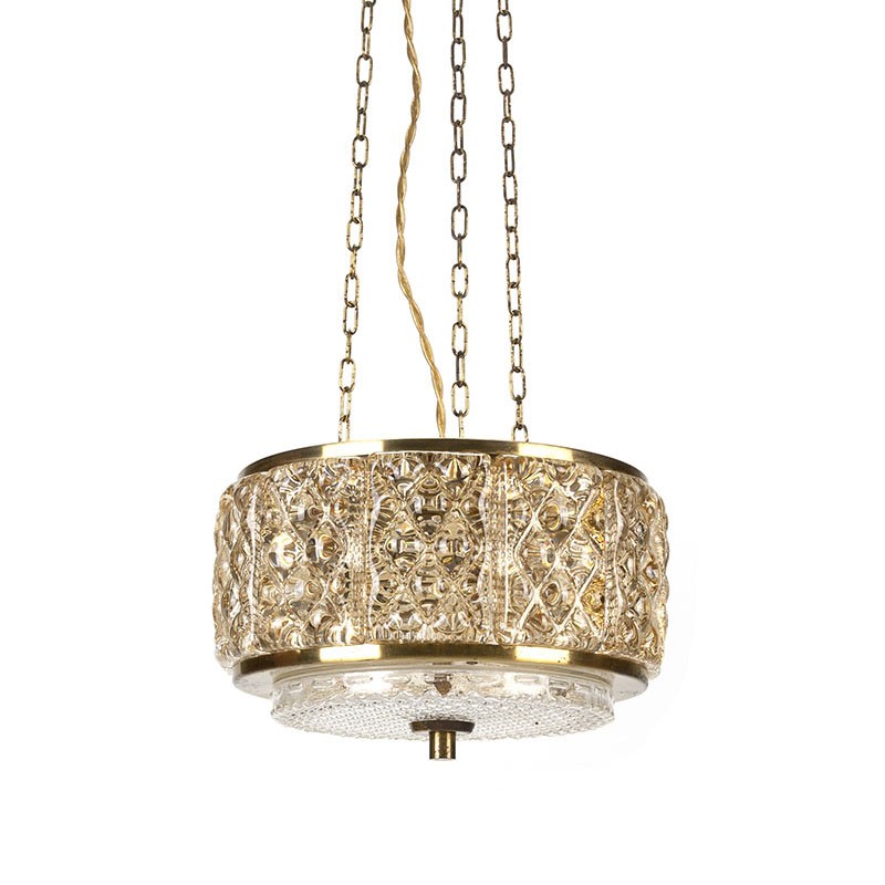 Danish vintage design hanging lamp of the brand Vitrika, type Gallapendel. Beautiful hanging lamp made of brass and glass. The condition is good, wiring has been checked, the brass has some light oxidation spots, see details. The dimensions are 25 cm in diameter and 15 cm high, the length of the cord is about 110 cm.