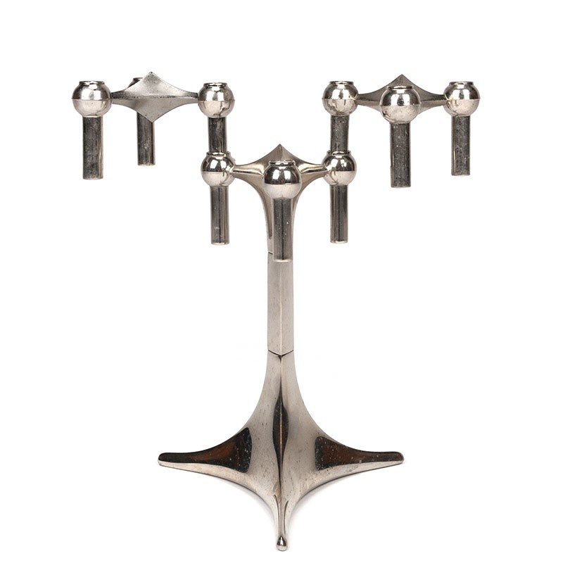 Mid-Century Design candlestick made up of 3 different parts. Beautiful design, inspired by molecular structures. Designed by Cesar Stoffi and Fritz Nagel in the mid-sixties for BMF. Suitable for thin candles. The condition is fair, there are oxidation spots visible, see details (price has been adjusted). The dimensions of the foot are 23 cm high and 17 cm wide, a separate candlestick is 9 cm in diameter.