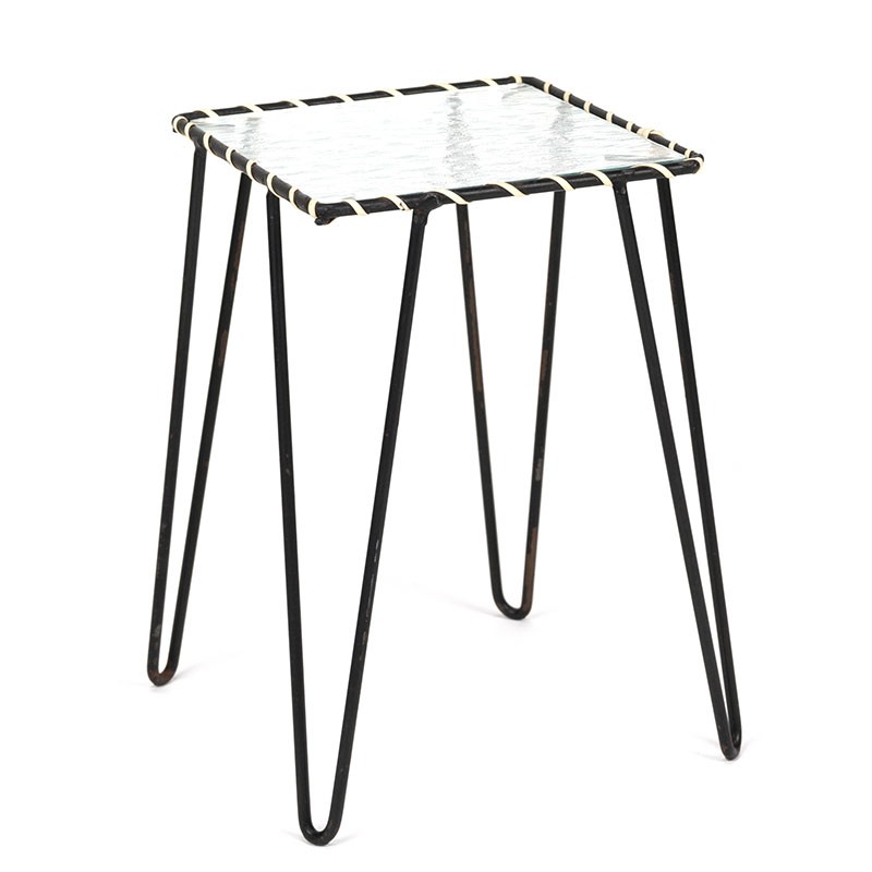 Vintage plant table from the fifties. Beautiful model with black metal frame with a cream detail. The glass top is loose. The condition is good considering the age, light signs of wear, see details. The dimensions are 16 cm wide and 24.5 cm high.