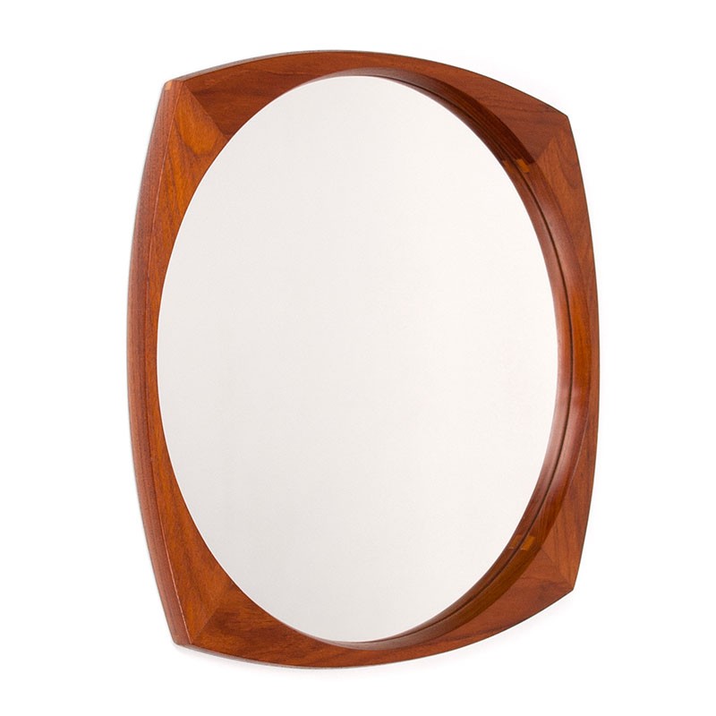 Danish vintage design mirror designed by the architect Rimbert Sandholdt. The mirror is marked on the back. Beautiful design in teak with special wood connection. The condition is good, minimal signs of use, see details. The dimensions are 42.5 cm wide and high, the depth is 2.5 cm.