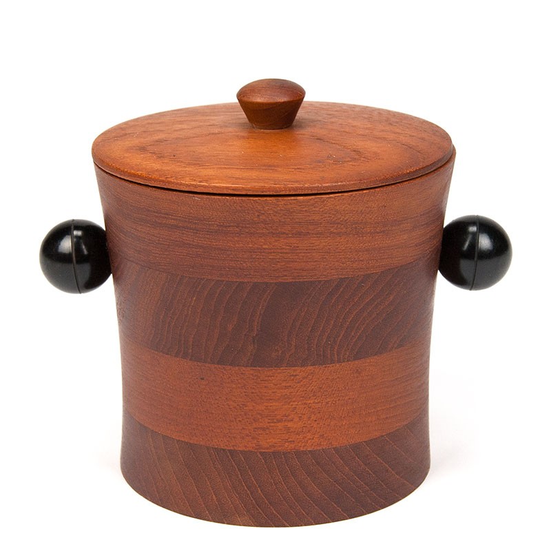 Teak Mid-Century Modern ice bucket, small model. Beautifully designed with loose stainless metal interior. The condition is good, see details. The dimensions are 11.5 cm in diameter and 12.5 cm high.