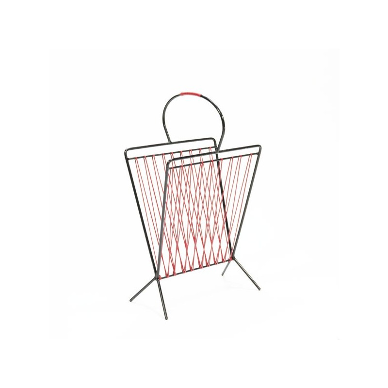 Vintage newspaper rack from the sixties. The rack consists of a black metal frame and red colored plastic. The condition is fairly good considering the age, slight traces of use, see detailed pictures. The size is 33 cm L / 28 cm W / 60 cm H.