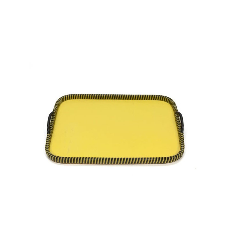 Vintage tray from the fifties with yellow / black tressed edge and yellow leaf. The condition is fairly good, there are some spots visible on the blade, see the detailed pictures. The dimensions are 42.5 cm L / 32,5 cm W.