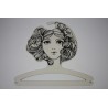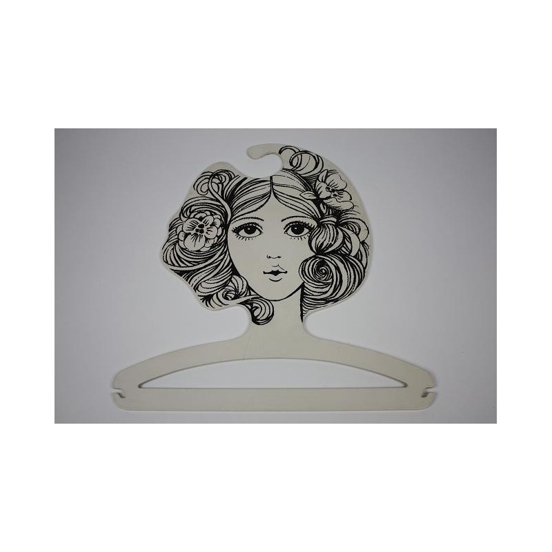 Plastic design clothes hanger with a caricature-like depiction of a woman. The clothes hanger is in good condition and is geprodureecd in W-Germany. The size is 36cm B / 36.5 cm H.