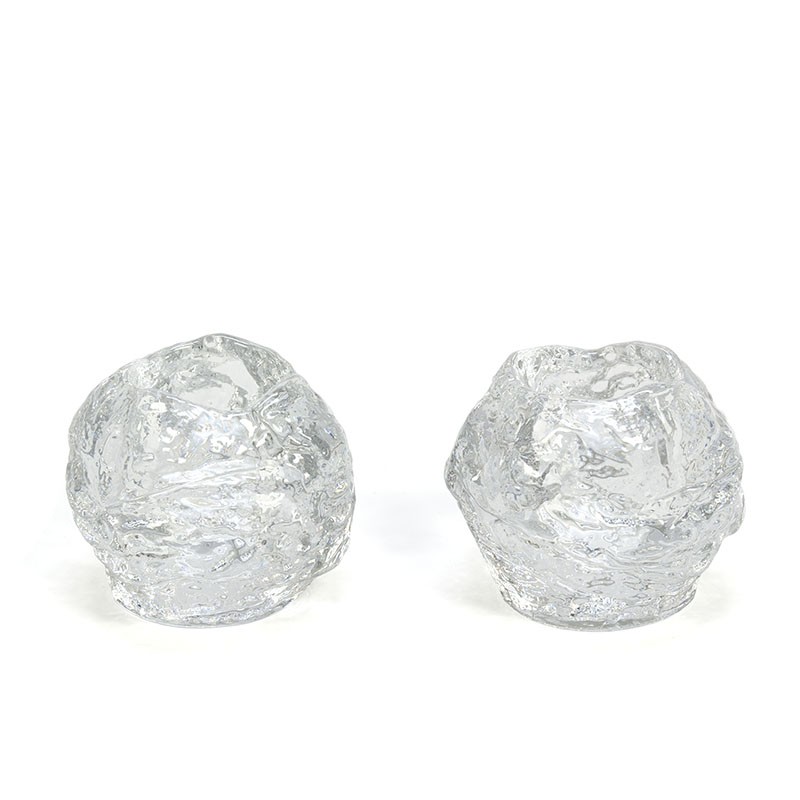 Swedish vintage set of 2 glass candlesticks suitable for tea lights. The candlesticks were designed by Ann Warff in 1973 for Kosta Boda. The condition is good, undamaged, see details. The dimensions are 7.5 cm high and 9 cm in diameter.