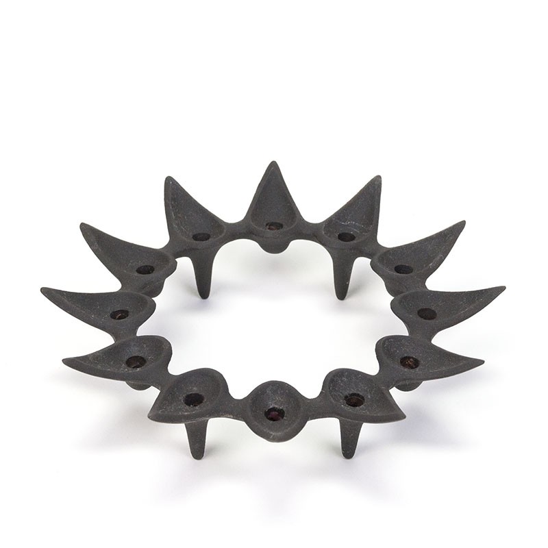 Cast iron candlestick designed by Jens Quistgaard and released by Dank design. Early vintage piece from the late fifties and early sixties. Nice star-shaped model for small, narrow candles. The condition is good considering the age, see details. The dimensions are 18.5 cm in diameter and 4.5 cm high.