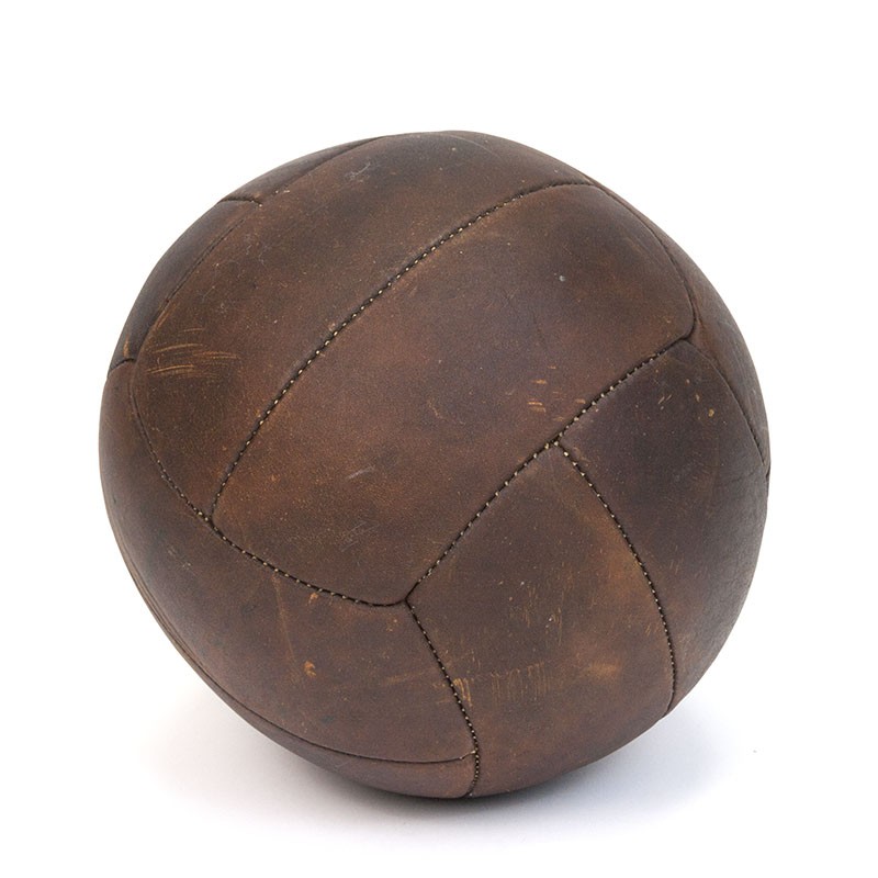 Vintage leather medicine ball from the forties / fifties. Decorative object. The condition is pretty good, the leather has some stains and scratches, see details. The dimensions are about 25 cm in diameter (the ball is not round).