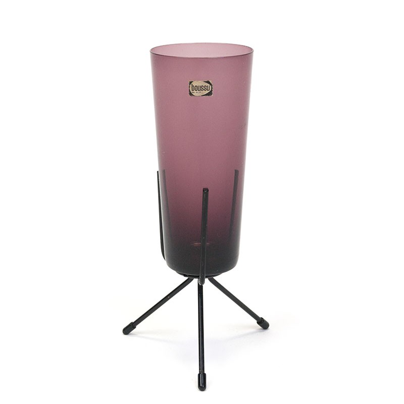 Small model vintage vase from the Belgian brand Boussu. The metal 3-leg frame is special. The condition is good, undamaged, see details. The dimensions are 6.5 cm in diameter (vase) and 21 cm high.