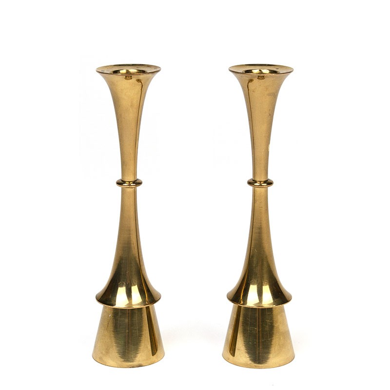 Set of 2 vintage candlesticks from the sixties, from Denmark. From the Danish brand Hyslop. Beautiful stylish design in brass. The condition is good considering the age, light spots visible in the brass, see details. The dimensions are 18.5 cm high and 4.2 cm in diameter.