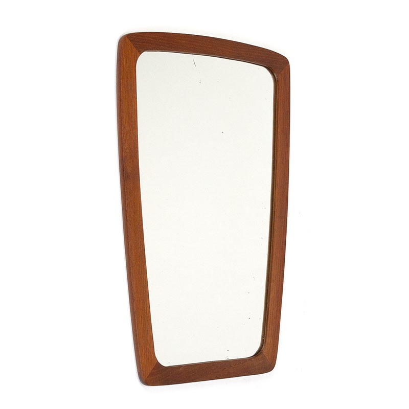 Danish small mirror from the late fifties, early sixties. The vintage mirror has a teak edge and organic design. The condition is good, minimal traces of use, see details. The dimensions are 30 cm wide and 46 cm high.