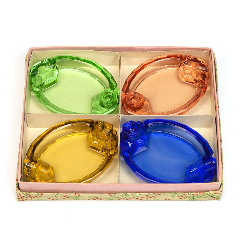 Vintage set of 4 glass ashtrays, in bright colours, from the former Czechoslovakia. The original gift box from the fifties is special. The condition is good, see details. The dimensions of the packaging are 17.5 cm long by 17 cm, the ashtrays are 9 cm long and 6.5 cm wide.