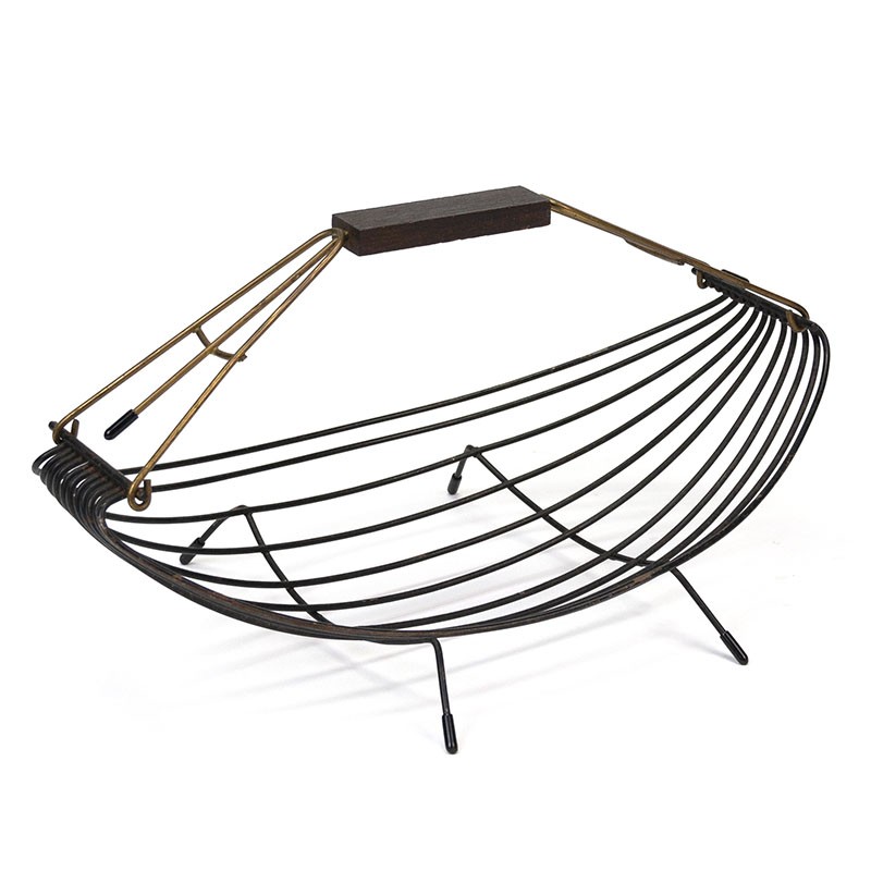 Fruit bowl from the fifties. The vintage model has a wenge wooden handle and is constructed from coated wire metal. The condition is good considering the age, some spots are visible, see details. The dimensions are 34 cm long, 20 cm wide and 18 cm high.