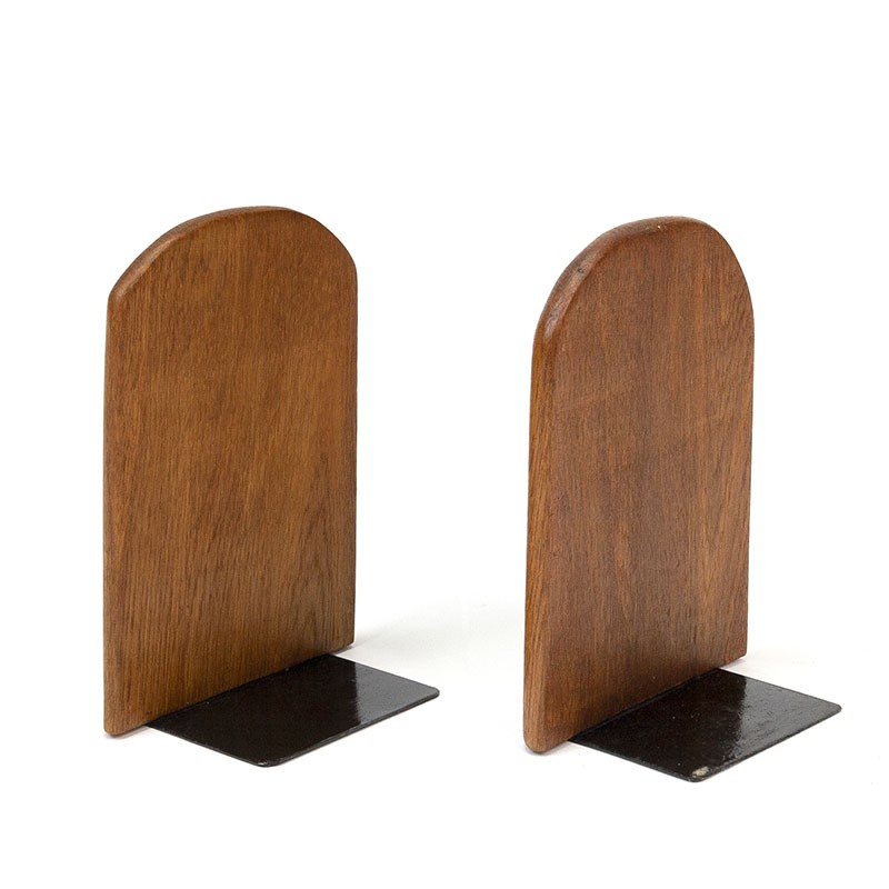 Vintage set of 2 bookends from the sixties. The set is made of oiled oak and has a black metal base. The condition is good considering the age, see details. The dimensions are 13 cm wide and 19 cm high.